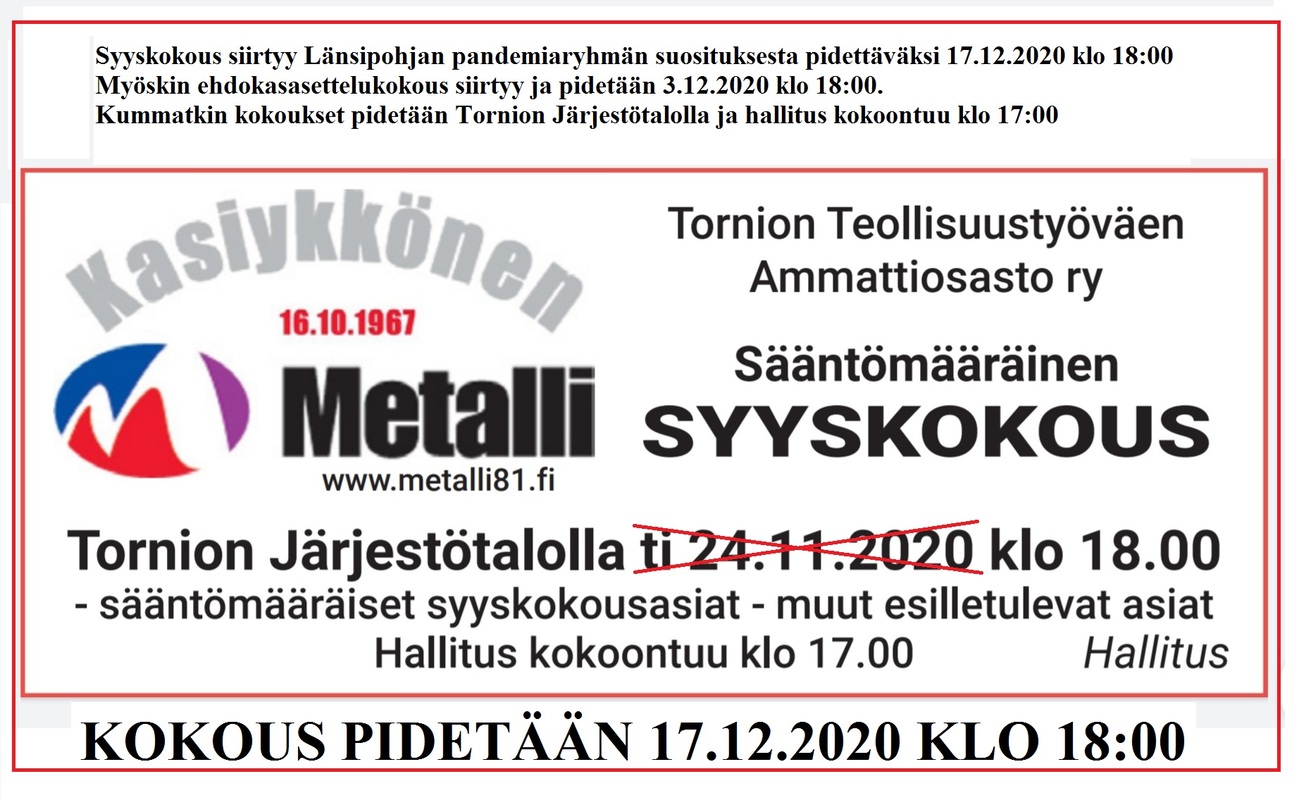 Syyskokous pidetään 17.12.2020 klo 18:00
