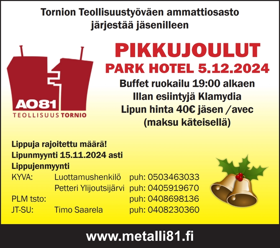 Pikkujoulut järjestetään 5.12.2024 Park Hotel Torniossa. Tervetuloa viettämään ammattiosaston pikkujouluja 5. joulukuuta 2024! Tapahtuma järjestetään Park Hotel Torniossa, ja illan aikana nautitaan buffet-ruokailusta sekä huippuesiintyjä Klamydian musiikista. Liput maksavat 40 euroa, ja niitä voi ostaa kuvassa näkyviltä henkilöiltä. (Klikkaa kuvaa suuremmaksi) Tule mukaan juhlimaan ja nauttimaan hyvästä seurasta! |